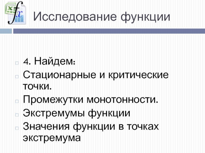 Исследование функции4. Найдем:Стационарные и критические точки. Промежутки монотонности.Экстремумы функцииЗначения функции в точках экстремума