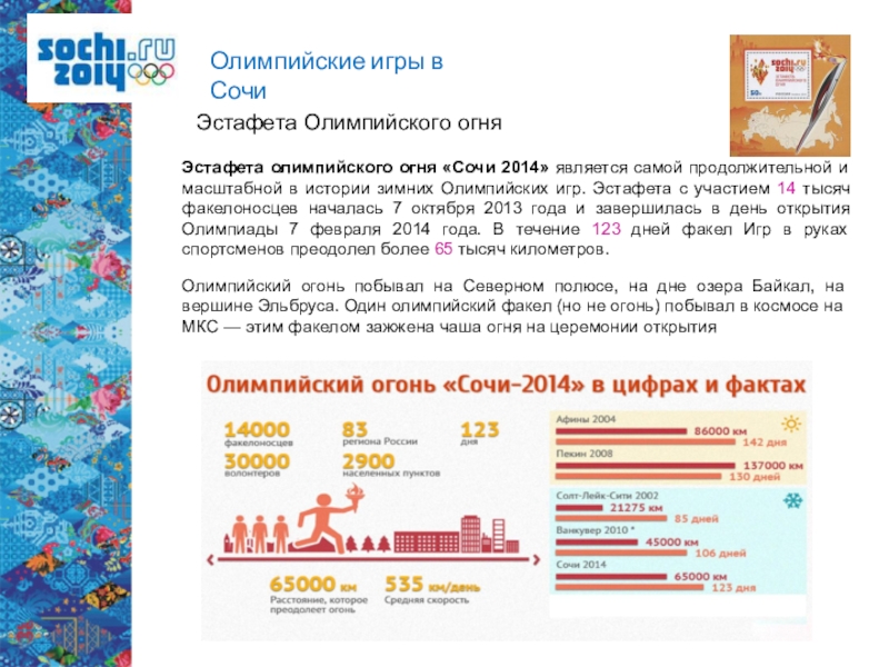 Олимпийский огонь побывал на Северном полюсе, на дне озера Байкал, на вершине Эльбруса. Один олимпийский факел (но не огонь) побывал в космосе на МКС — этим факелом зажжена чаша огня на церемонии открытия