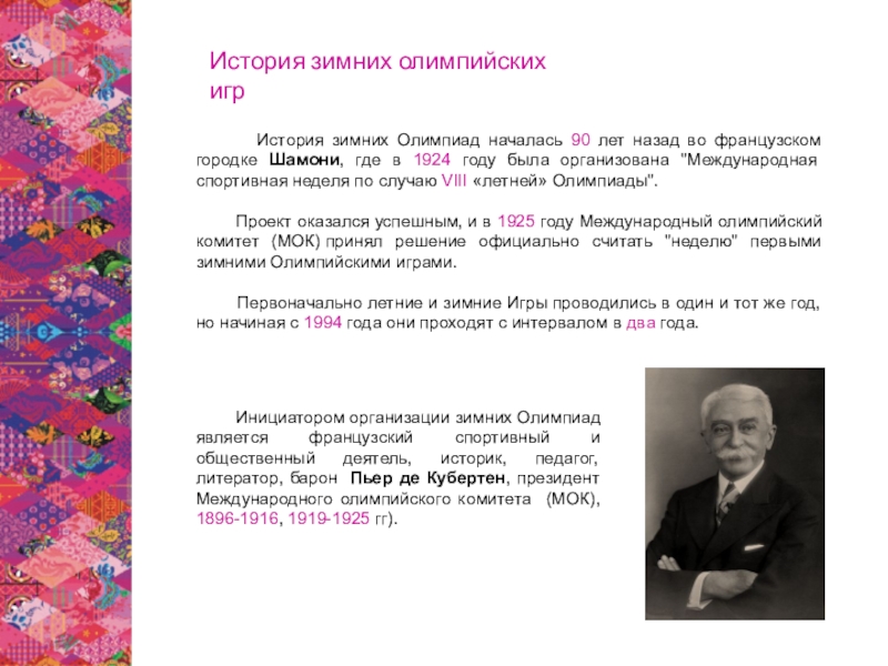 Инициатором организации зимних Олимпиад является французский спортивный и общественный деятель, историк, педагог, литератор, барон Пьер де Кубертен, президент Международного олимпийского комитета (МОК), 1896-1916, 1919-1925 гг).