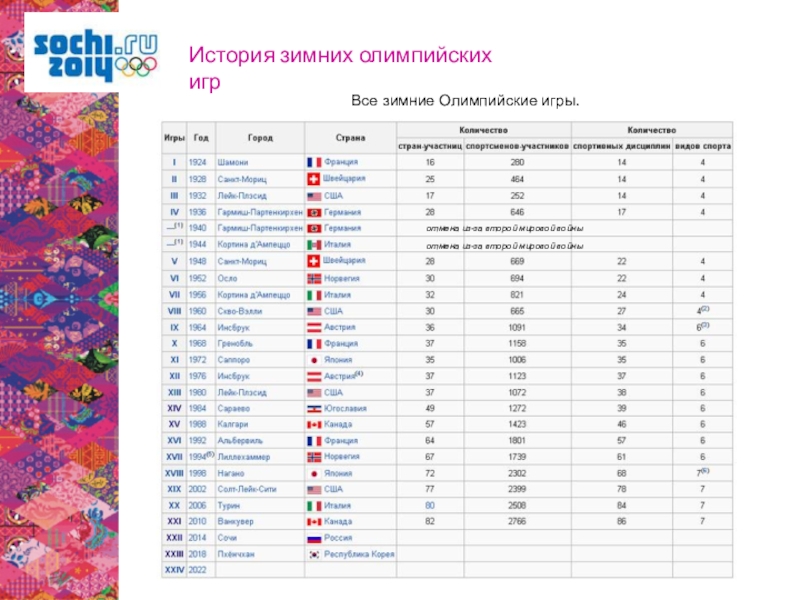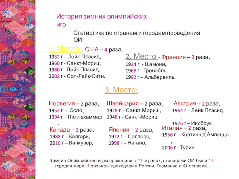 Зимние Олимпийские игры проходили в 11 странах, столицами ОИ были 17 городов мира. 1 раз игры проходили в России, Германии и Югославии.