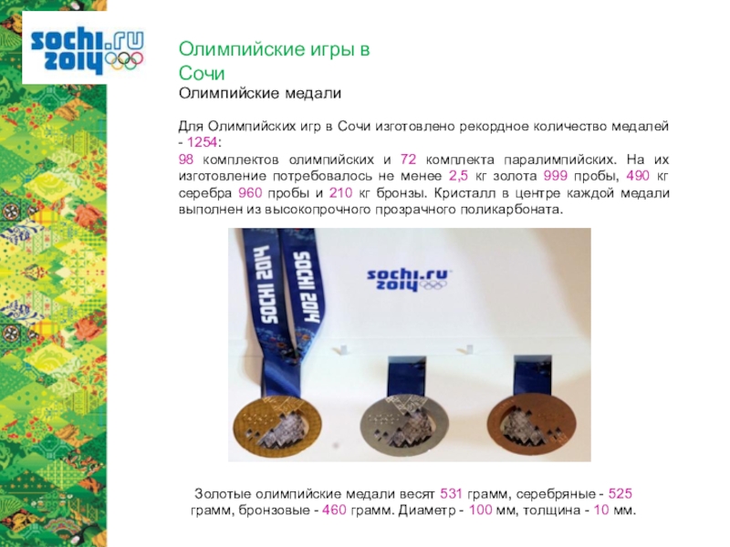 Золотые олимпийские медали весят 531 грамм, серебряные - 525 грамм, бронзовые - 460 грамм. Диаметр - 100 мм, толщина - 10 мм.
