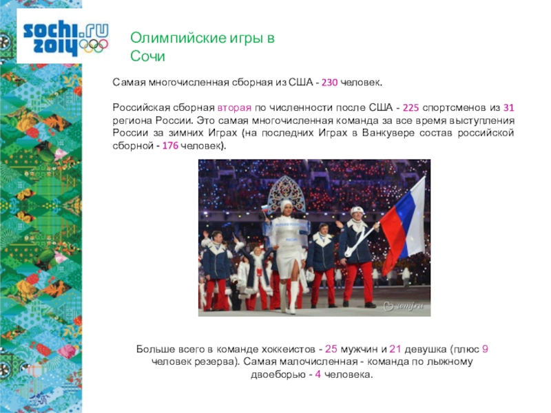 Больше всего в команде хоккеистов - 25 мужчин и 21 девушка (плюс 9 человек резерва). Самая малочисленная - команда по лыжному двоеборью - 4 человека.