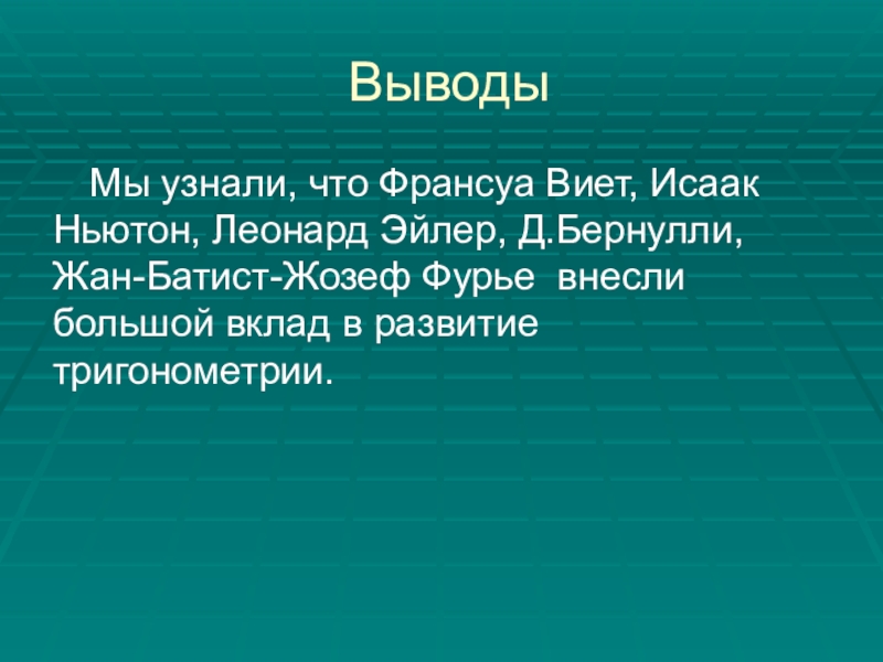 ВыводыМы узнали, что Франсуа Виет, Исаак Ньютон, Леонард Эйлер, Д.Бернулли, Жан-Батист-Жозеф Фурье внесли большой вклад в развитие