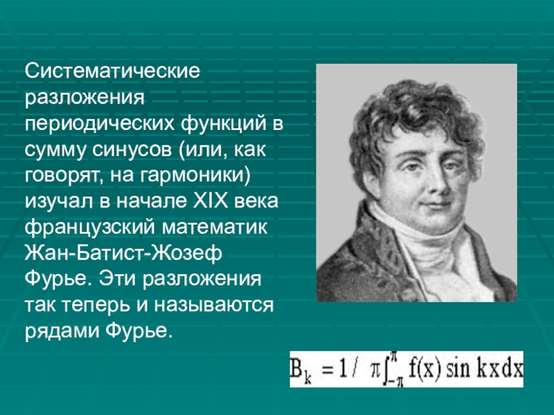 Систематические разложения периодических функций в сумму синусов (или, как говорят, на гармоники) изучал в начале XIX века