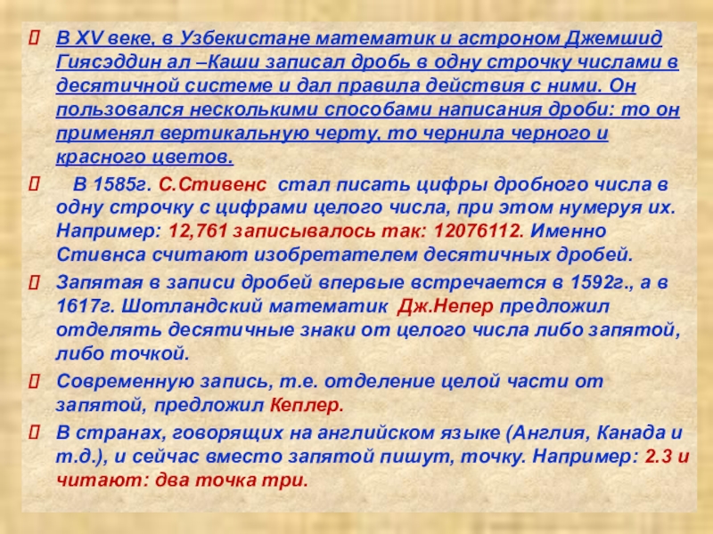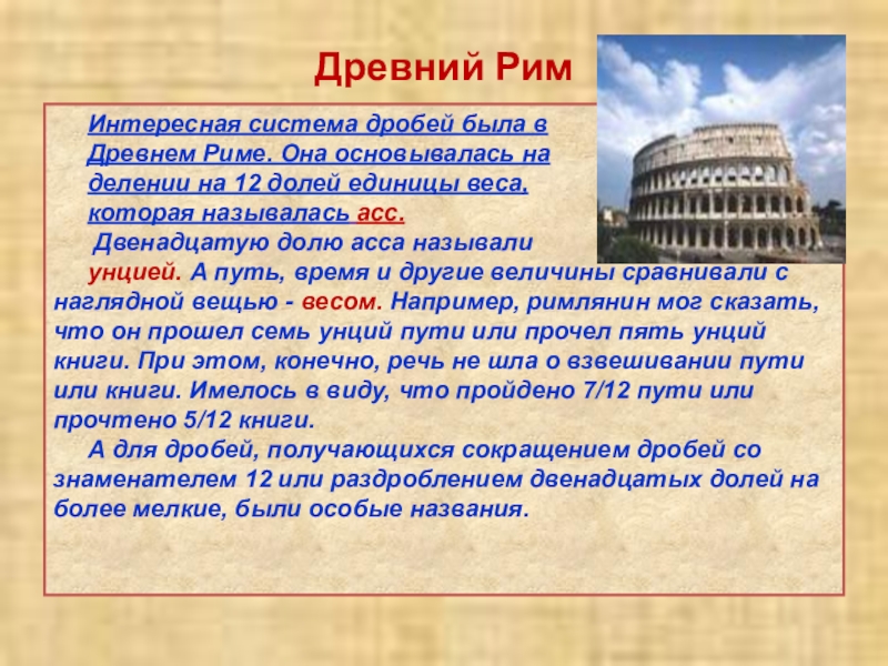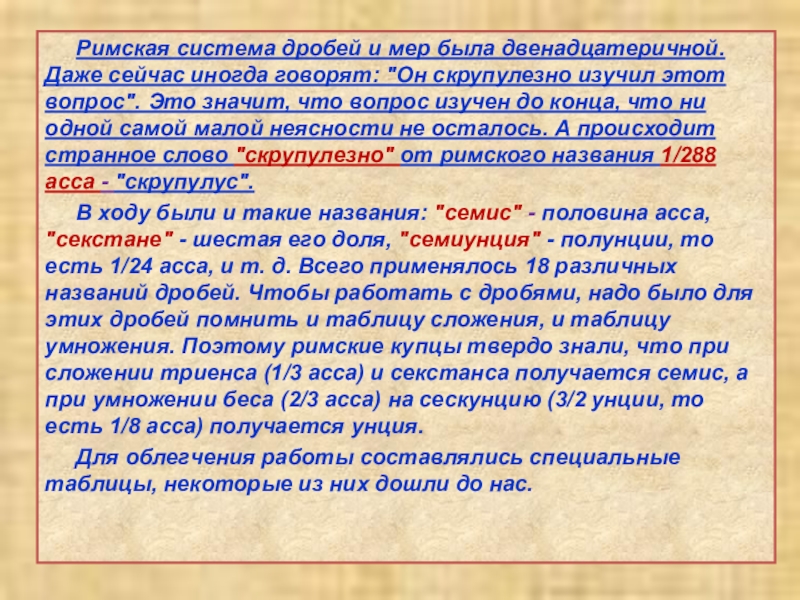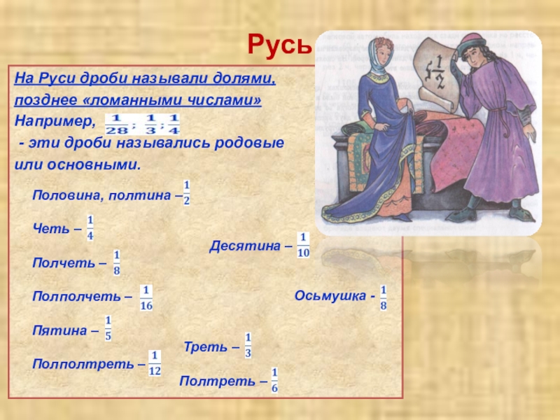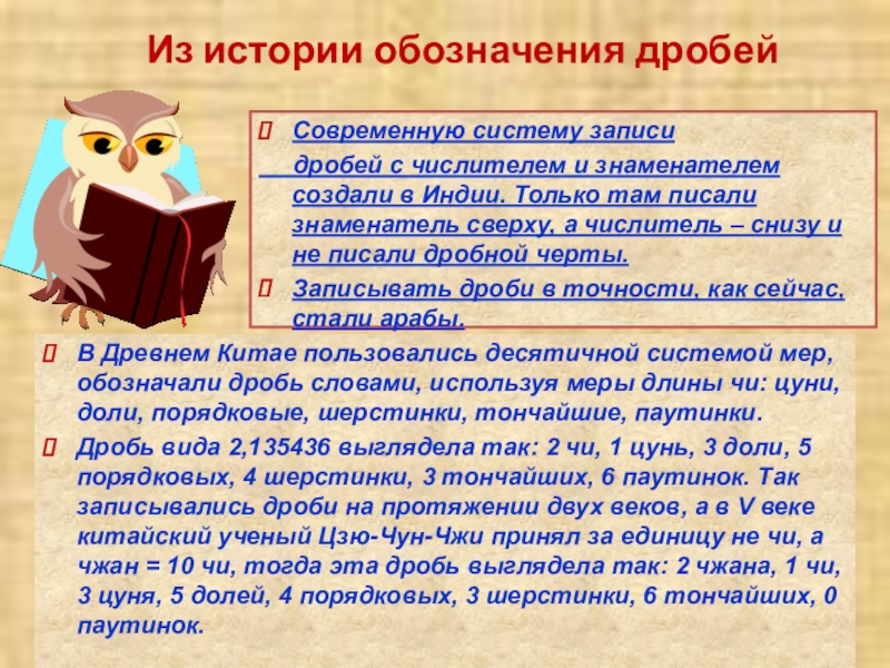 В Древнем Китае пользовались десятичной системой мер, обозначали дробь словами, используя меры длины чи: цуни, доли, порядковые, шерстинки, тончайшие, паутинки.