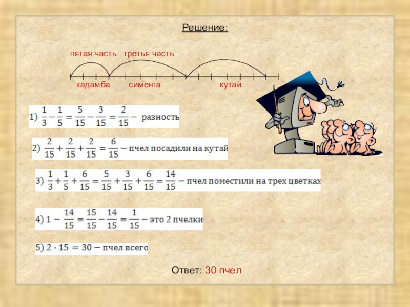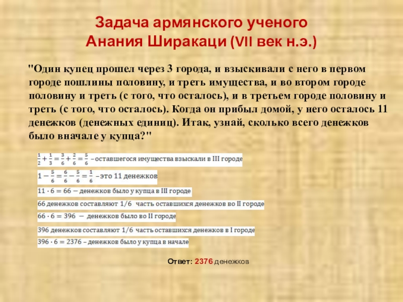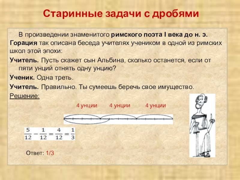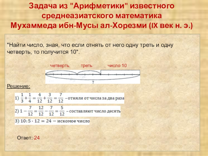 "Найти число, зная, что если отнять от него одну треть и одну четверть, то получится 10".