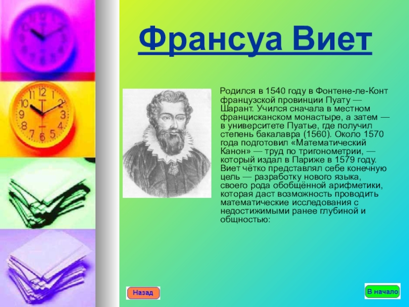 французской провинции Пуату — Шарант. Учился сначала в местном францисканском монастыре, а затем — в университете Пуатье, где получил степень бакалавра (1560). Около 1570 года подготовил «Математический Канон» — труд по тригонометрии, — который издал в Париже в 1579 году. Виет чётко представлял себе конечную цель — разработку нового языка, своего рода обобщённой арифметики, которая даст возможность проводить математические исследования с недостижимыми ранее глубиной и общностью: