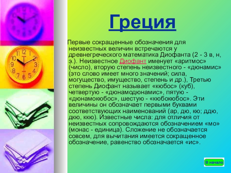 математика Диофанта (2 - 3 в, н, э.). Неизвестное Диофант именует «аритмос» (число), вторую степень неизвестного - «дюнамис» (это слово имеет много значений; сила, могущество, имущество, степень и др.), Третью степень Диофант называет «кюбос» (куб), четвертую - «дюнамодюнамис», пятую - «дюнамокюбос», шестую - «кюбокюбос». Эти