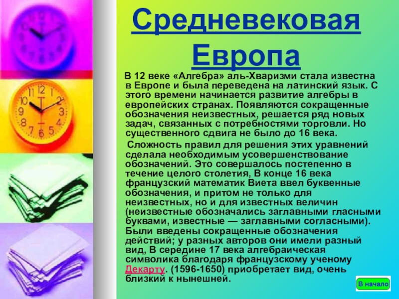 в Европе и была переведена на латинский язык. С этого времени начинается развитие алгебры в европейских странах. Появляются сокращенные обозначения неизвестных, решается ряд новых задач, связанных с потребностями торговли. Но существенного сдвига не было до 16 века.