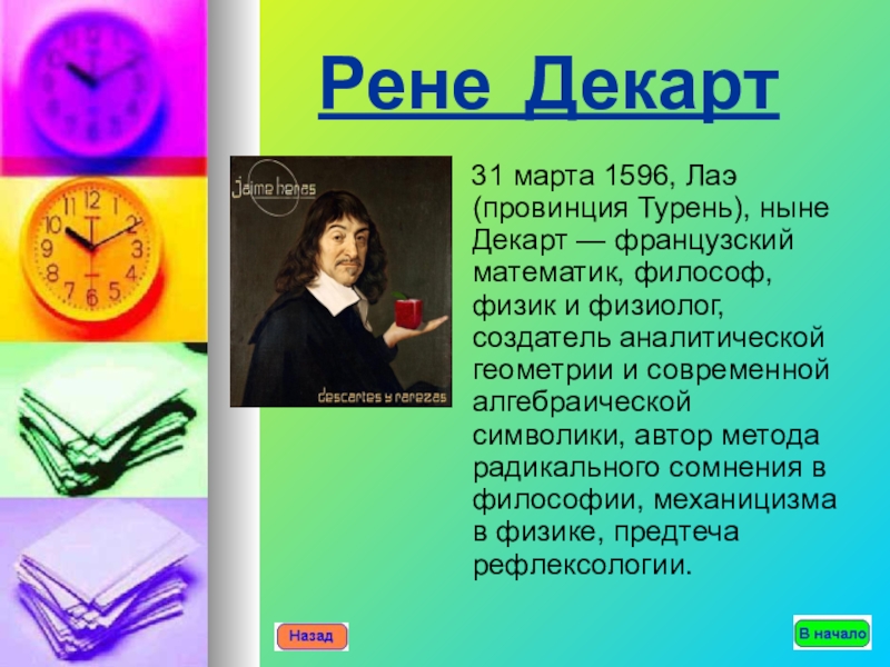 — французский математик, философ, физик и физиолог, создатель аналитической геометрии и современной алгебраической символики, автор метода радикального сомнения в философии, механицизма в физике, предтеча рефлексологии.