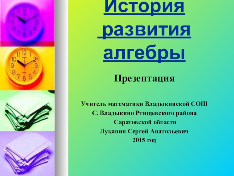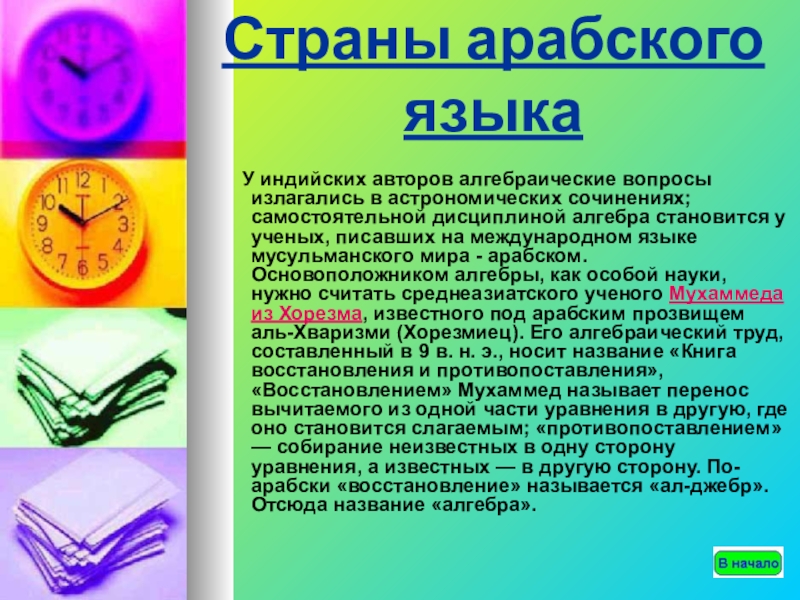 в астрономических сочинениях; самостоятельной дисциплиной алгебра становится у ученых, писавших на международном языке мусульманского мира - арабском. Основоположником алгебры, как особой науки, нужно считать среднеазиатского ученого Мухаммеда из Хорезма, известного под арабским прозвищем аль-Хваризми (Хорезмиец). Его алгебраический труд, составленный в 9 в. н. э., носит название «Книга восстановления и противопоставления», «Восстановлением» Мухаммед называет перенос вычитаемого из одной части уравнения в другую, где оно становится слагаемым; «противопоставлением»— собирание неизвестных в одну сторону уравнения, а известных — в другую сторону. По-арабски «восстановление» называется «ал-джебр». Отсюда название «алгебра».