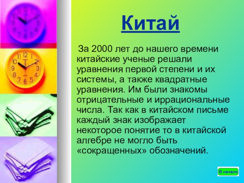 уравнения первой степени и их системы, а также квадратные уравнения. Им были знакомы отрицательные и иррациональные числа. Так как в китайском письме каждый знак изображает некоторое понятие то в китайской алгебре не могло быть «сокращенных» обозначений.
