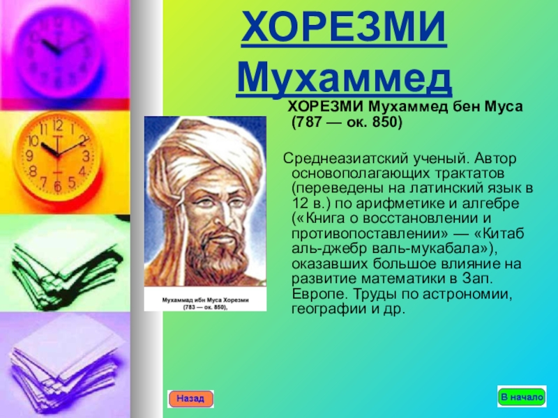 Среднеазиатский ученый. Автор основополагающих трактатов (переведены на латинский язык в 12 в.) по арифметике и алгебре («Книга о восстановлении и противопоставлении» — «Китаб аль-джебр валь-мукабала»), оказавших большое влияние на развитие математики в Зап. Европе. Труды по астрономии, географии и др.