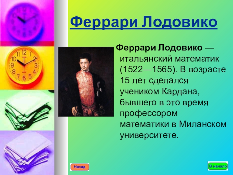 Феррари Лодовико — итальянский математик (1522—1565). В возрасте 15