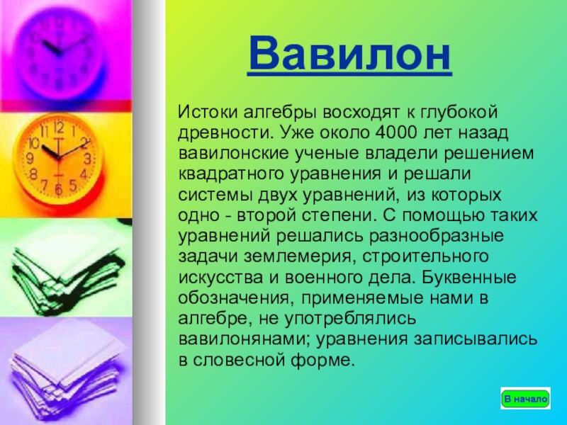 лет назад вавилонские ученые владели решением квадратного уравнения и решали системы двух уравнений, из которых одно - второй степени. С помощью таких уравнений решались разнообразные задачи землемерия, строительного искусства и военного дела. Буквенные обозначения, применяемые нами в алгебре, не употреблялись вавилонянами; уравнения записывались в словесной форме.