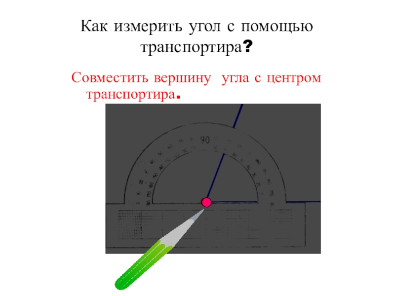 Как измерить угол с помощью транспортира?Совместить вершину угла с центром транспортира.