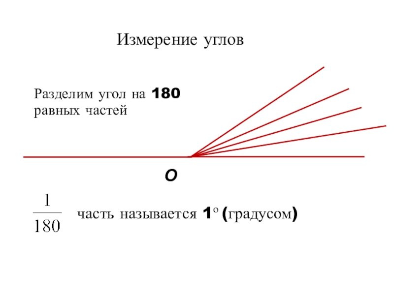 Измерение угловОРазделим угол на 180 равных частейчасть называется 1о (градусом)