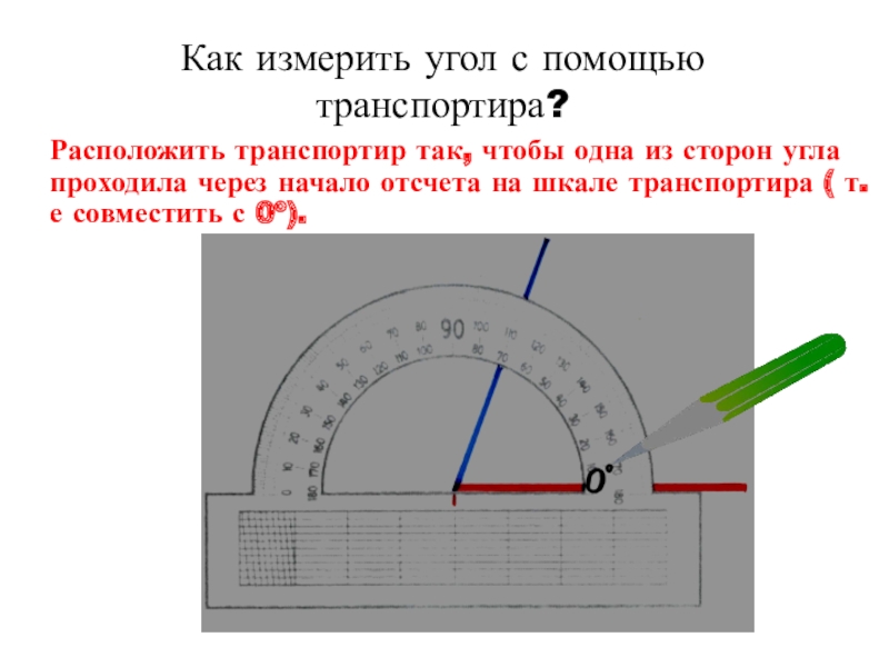 Как измерить угол с помощью транспортира?Расположить транспортир так, чтобы одна из сторон угла проходила через начало отсчета