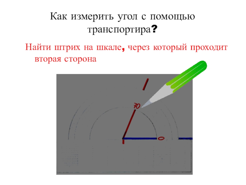 Как измерить угол с помощью транспортира?Найти штрих на шкале, через который проходит вторая сторона