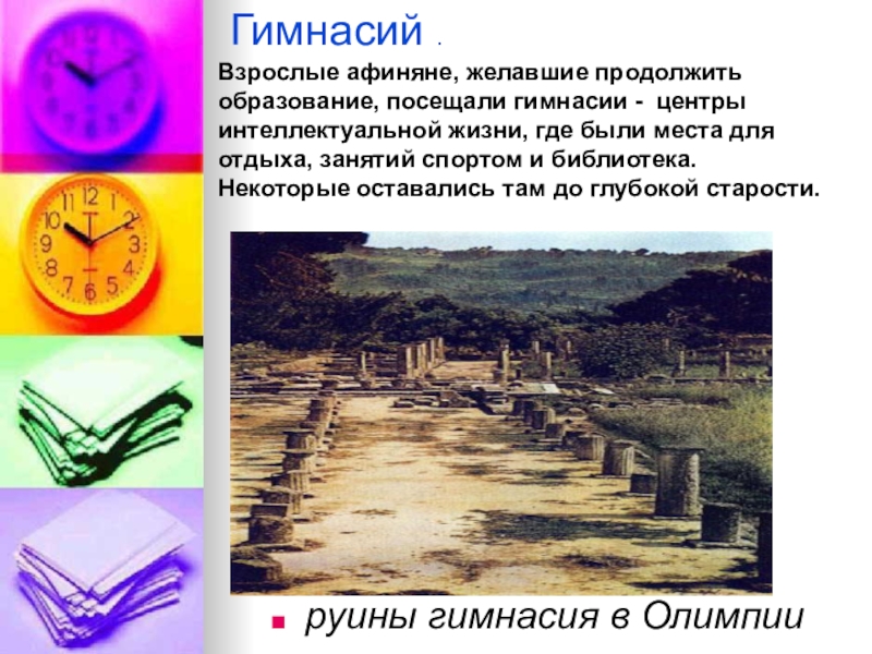 Гимнасий. Взрослые афиняне, желавшие продолжить образование, посещали гимнасий - центры интеллектуальной жизни, где были места для отдыха, занятия спортом и библиотеки. Некоторые оставались там до глубокой старости.