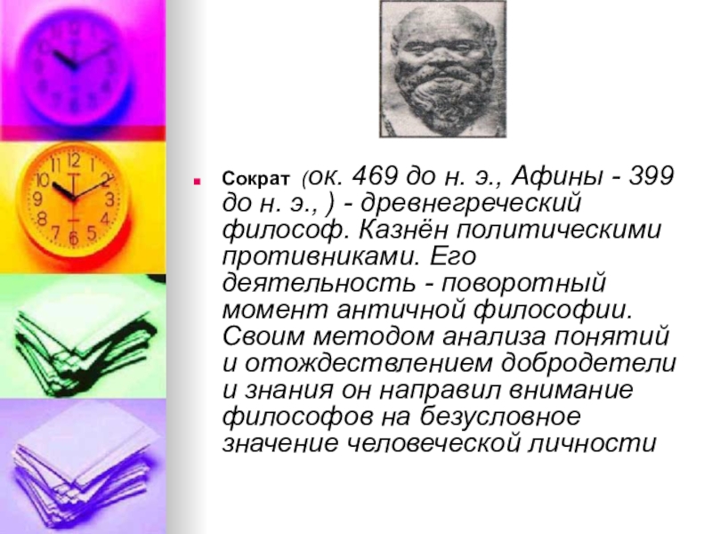 э., ) - древнегреческий философ. Казнён политическими противниками. Его деятельность - поворотный момент античной философии. Своим методом анализа понятий и отождествлением добродетели и знания он направил внимание философов на безусловное значение человеческой личности