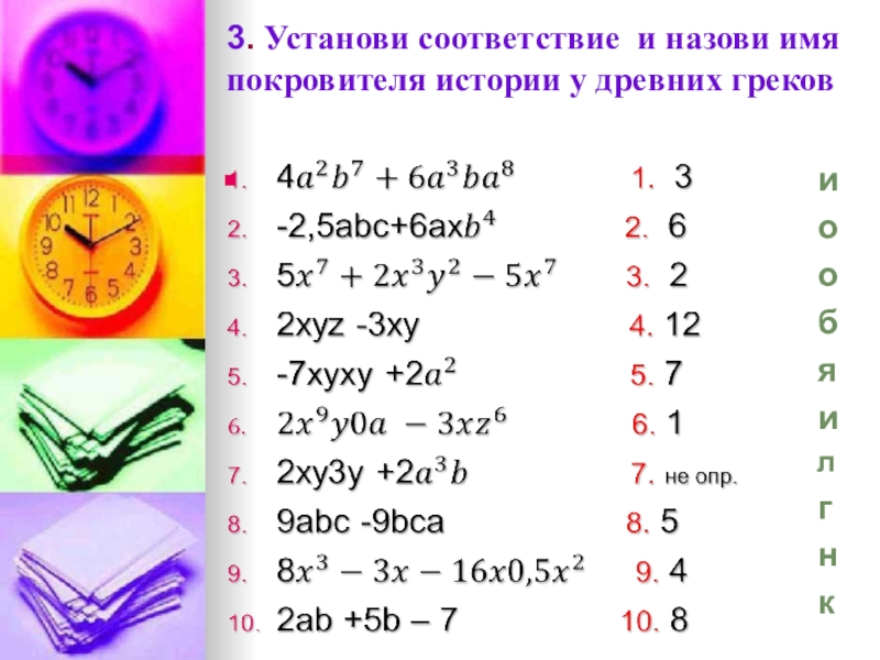 Слайд 83. Установи соответствие и назови имя покровителя истории у древних греков