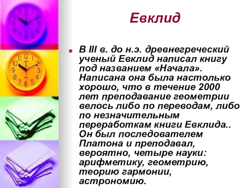 под названием «Начала». Написана она была настолько хорошо, что в течение 2000 лет преподавание геометрии велось либо по переводам, либо по незначительным переработкам книги Евклида.. Он был последователем Платона и преподавал, вероятно, четыре науки: арифметику, геометрию, теорию гармонии, астрономию.