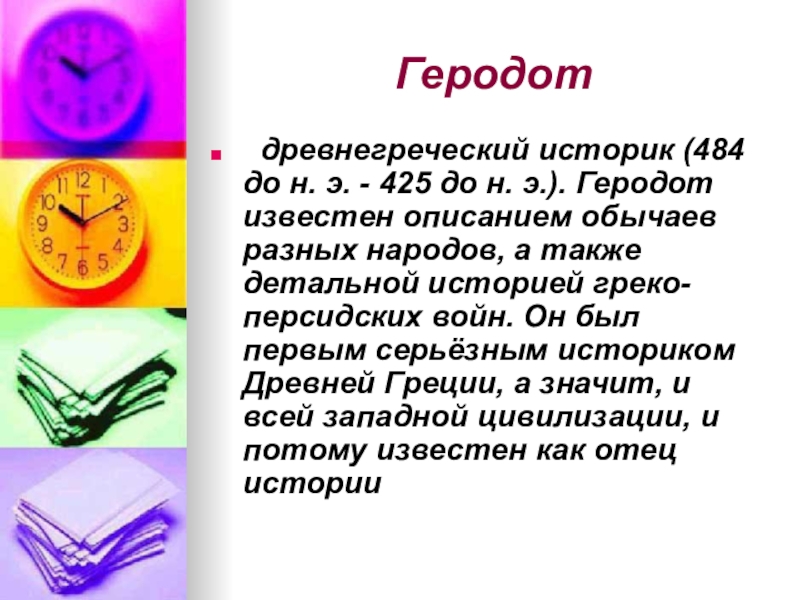 э.). Геродот известен описанием обычаев разных народов, а также детальной историей греко-персидских войн. Он был первым серьёзным историком Древней Греции, а значит, и всей западной цивилизации, и потому известен как отец истории