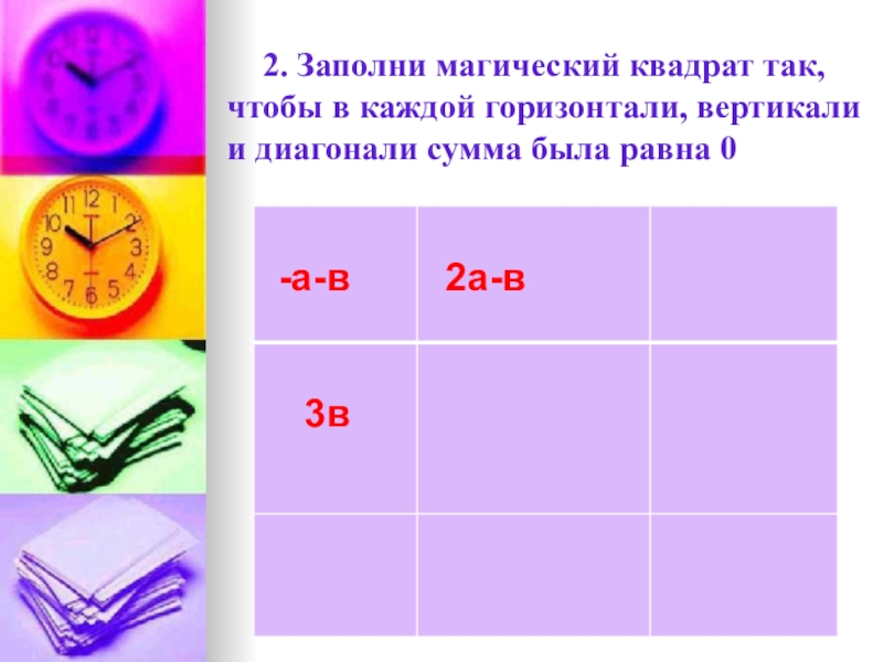 Слайд 72. Заполни магический квадрат так, чтобы в каждой горизонтали, вертикали и