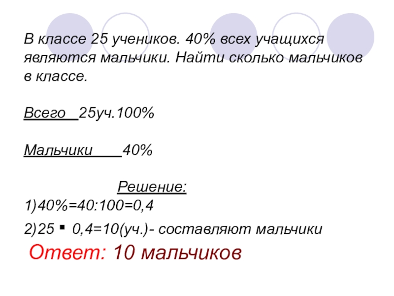 Слайд 6В классе 25 учеников. 40% всех учащихся являются мальчики. Найти сколько