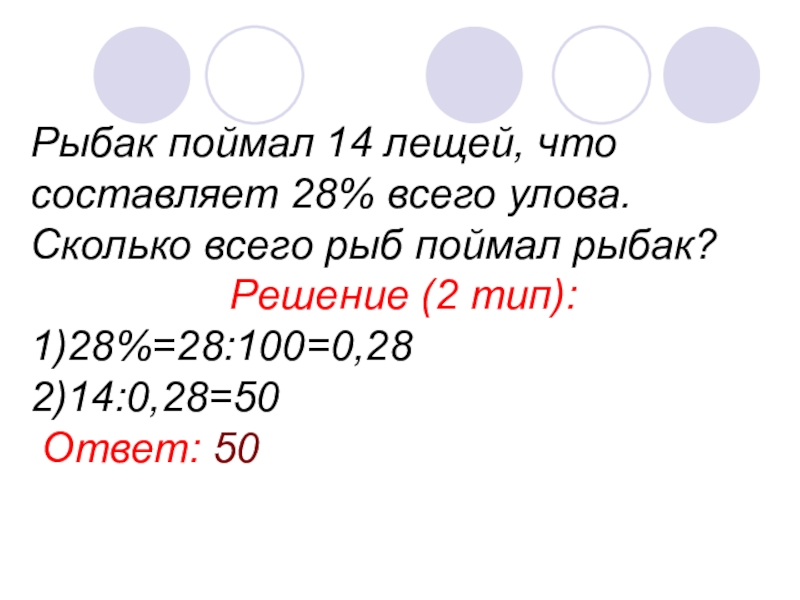 Слайд 10Рыбак поймал 14 лещей, что составляет 28% всего улова.