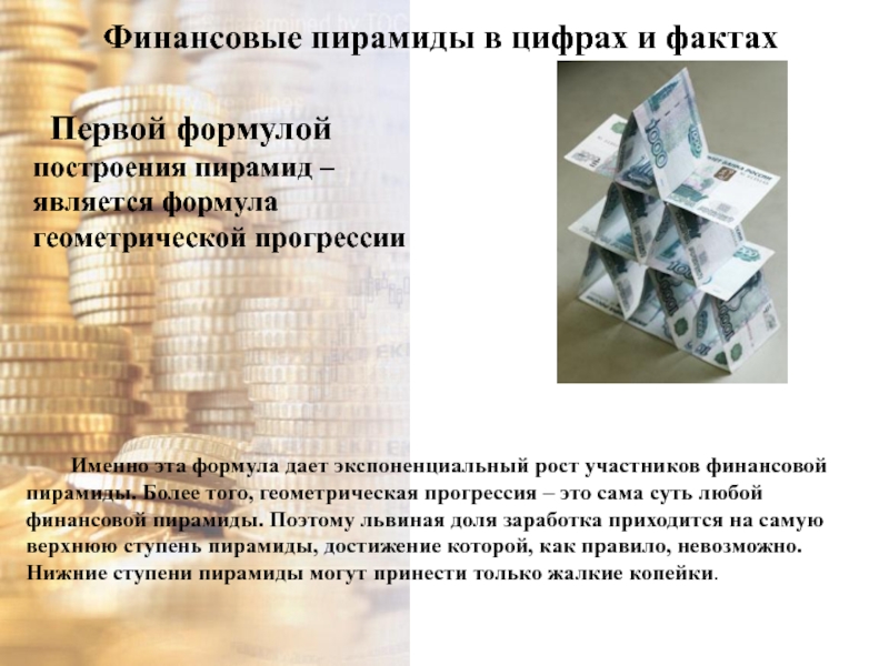 Именно эта формула дает экспоненциальный рост участников финансовой пирамиды. Более того, геометрическая прогрессия – это сама суть любой финансовой пирамиды. Поэтому львиная доля заработка приходится на самую верхнюю ступень пирамиды, достижение которой, как правило, невозможно. Нижние ступени пирамиды могут принести только жалкие копейки.