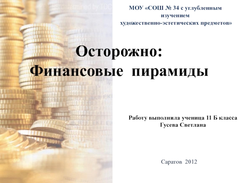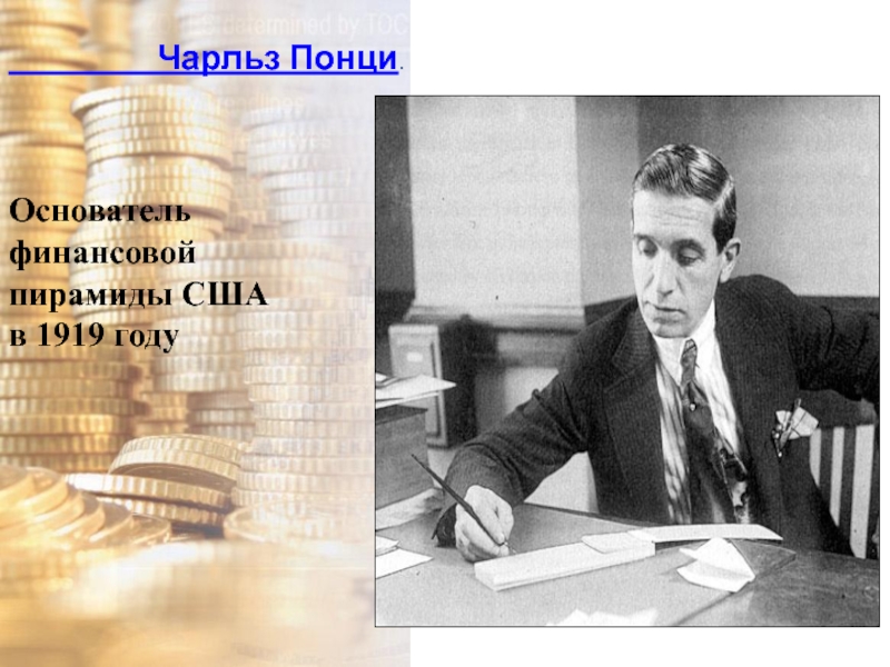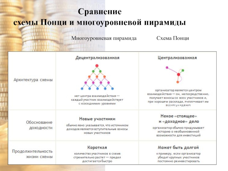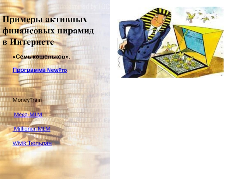 Цель моей работы: рассмотреть историю возникновения финансовых пирамид, их разновидности, структуры построения, схемы и формулы, по которым они действуют.
