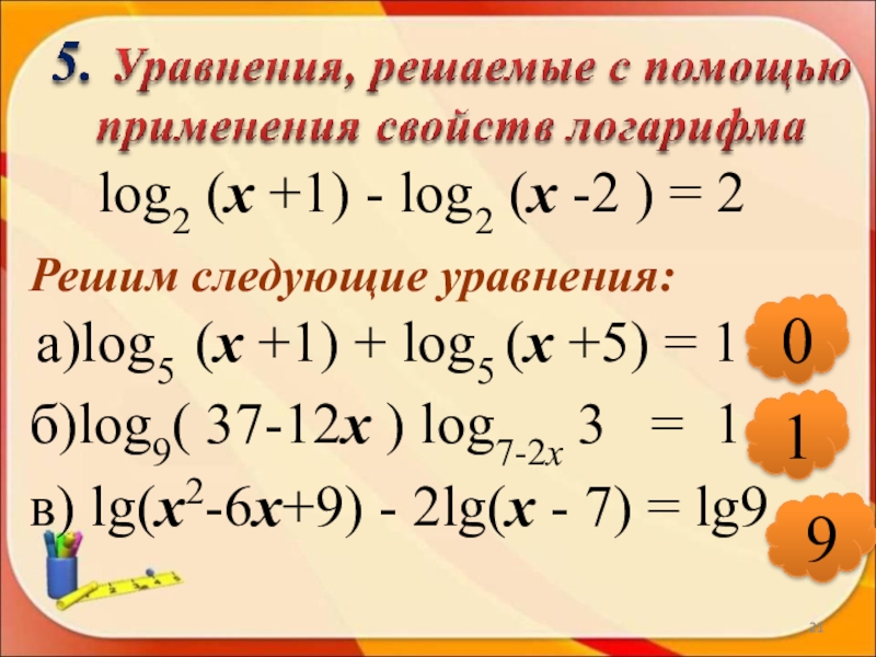 в) lg(х2-6х+9) - 2lg(х - 7) = lg9