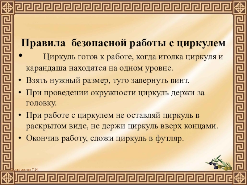 При работе с циркулем не оставляй циркуль в раскрытом виде, не держи циркуль вверх концами.