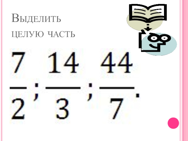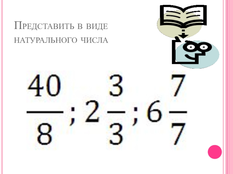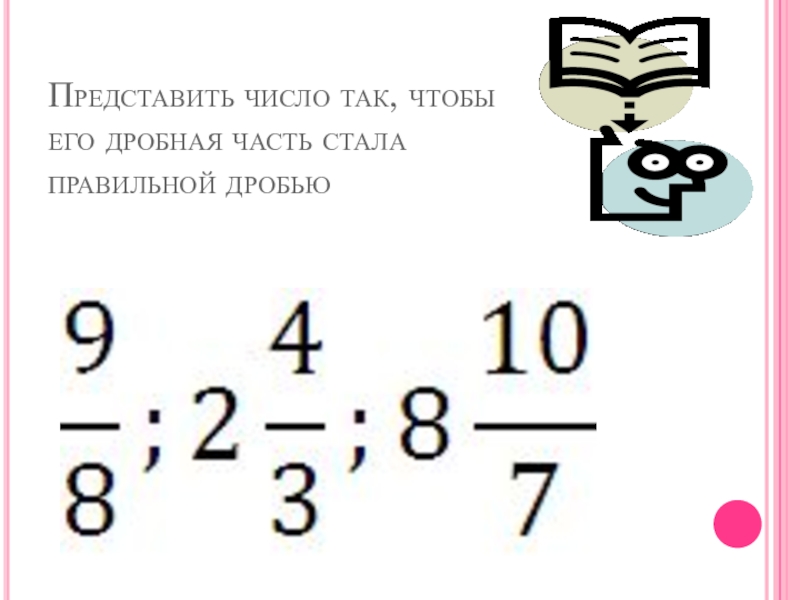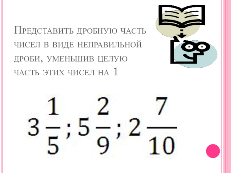 Слайд 8Представить дробную часть чисел в виде неправильной дроби, уменьшив целую часть