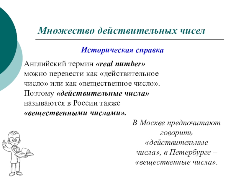 В Москве предпочитают говорить «действительные числа», в Петербурге – «вещественные числа».