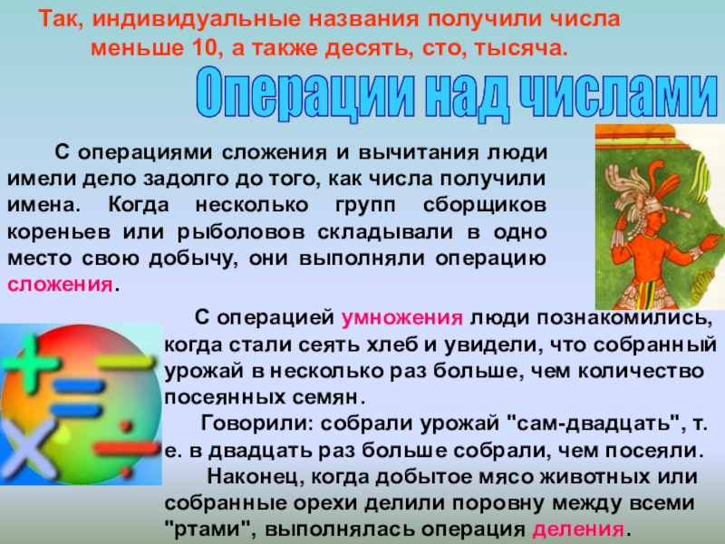 С операциями сложения и вычитания люди имели дело задолго до того, как числа получили имена. Когда несколько групп сборщиков кореньев или рыболовов складывали в одно место свою добычу, они выполняли операцию сложения.