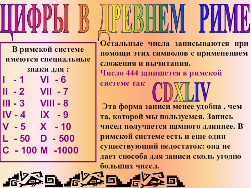 Эта форма записи менее удобна , чем та, которой мы пользуемся. Запись чисел получается намного длиннее. В римской системе есть и еще один существующий недостаток: она не дает способа для записи сколь угодно больших чисел.
