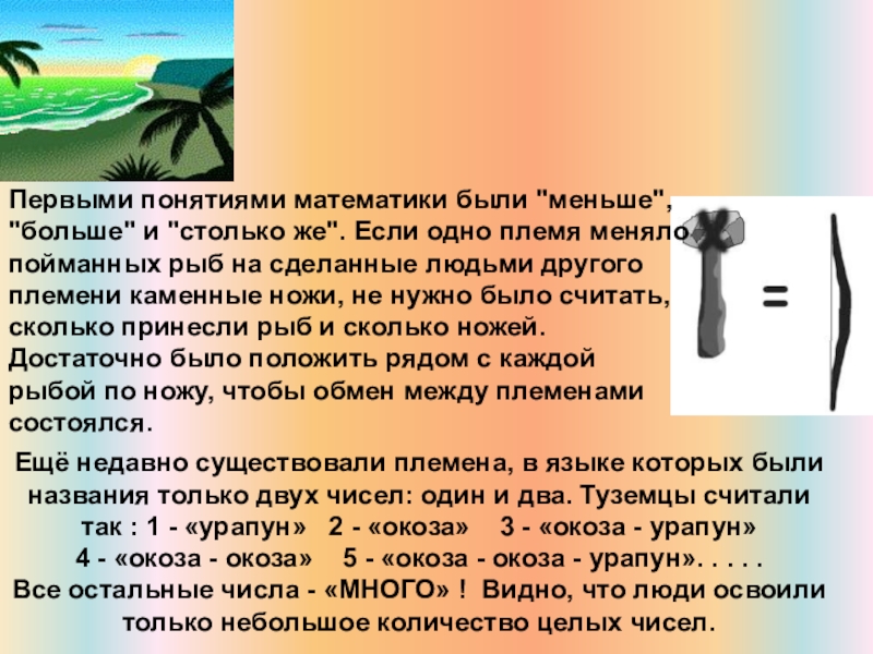 Первыми понятиями математики были "меньше", "больше" и "столько же". Если одно племя меняло пойманных рыб на сделанные людьми другого племени каменные ножи, не нужно было считать, сколько принесли рыб и сколько ножей. Достаточно было положить рядом с каждой рыбой по ножу, чтобы обмен между племенами состоялся.