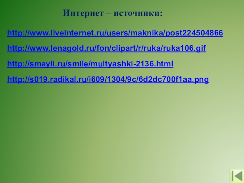 Интернет – источники:http://www.liveinternet.ru/users/maknika/post224504866 http://www.lenagold.ru/fon/clipart/r/ruka/ruka106.gif http://smayli.ru/smile/multyashki-2136.htmlhttp://s019.radikal.ru/i609/1304/9c/6d2dc700f1aa.png
