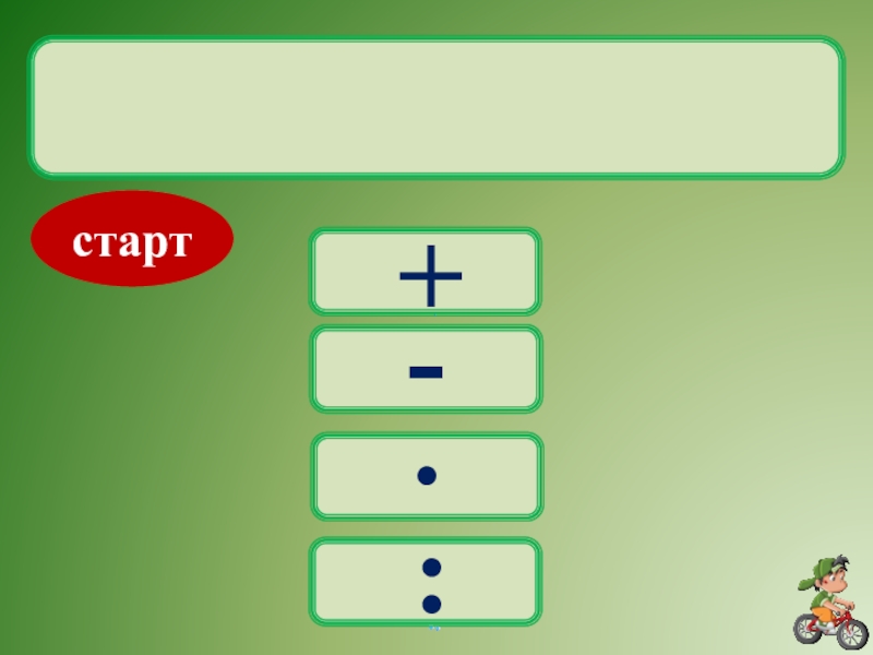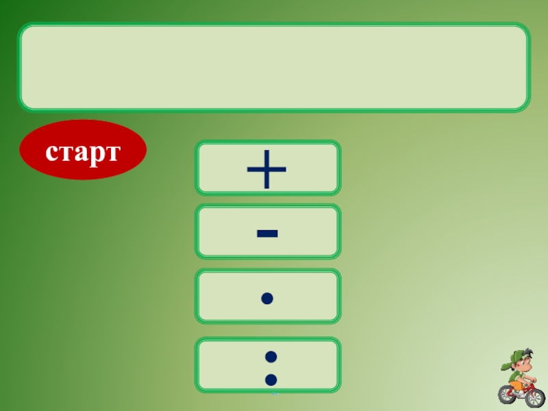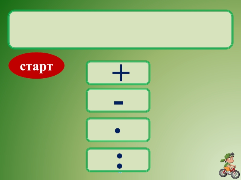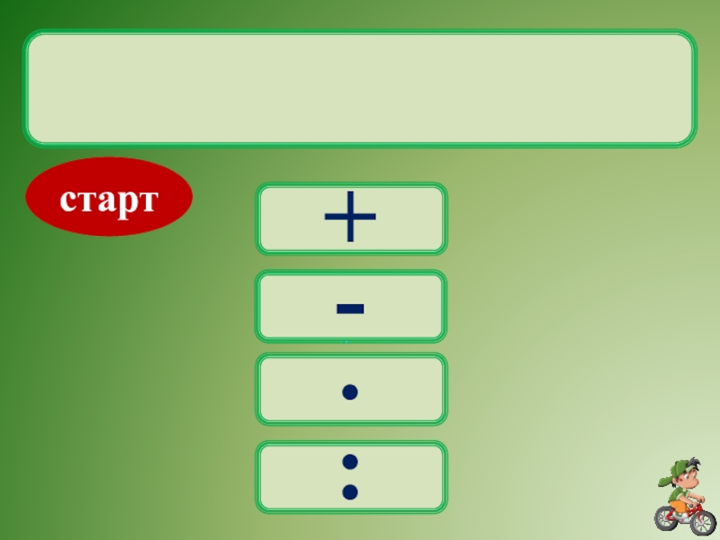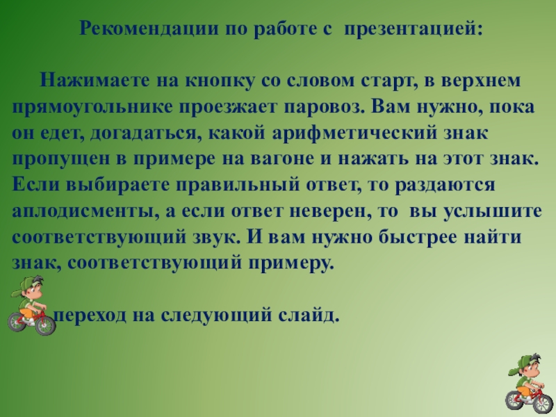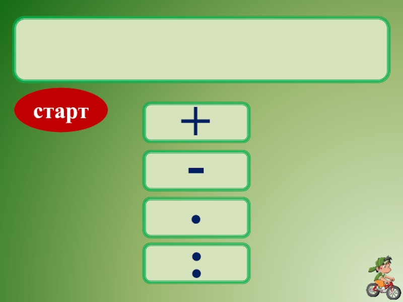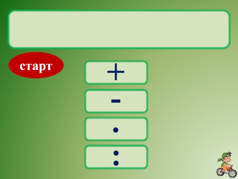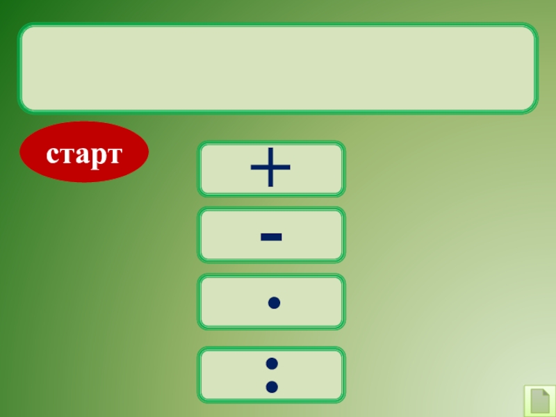 Рекомендации по работе с презентацией: Нажимаете на кнопку со словом старт, в верхнем прямоугольнике проезжает паровоз. Вам нужно, пока он едет, догадаться, какой арифметический знак пропущен в примере на вагоне и нажать на этот знак. Если
