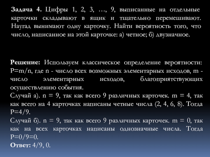 Задача 4. Цифры 1, 2, 3, …, 9, выписанные на отдельные карточки складывают в ящик и тщательно перемешивают. Наугад вынимают одну карточку. Найти вероятность того, что число, написанное на этой карточке: