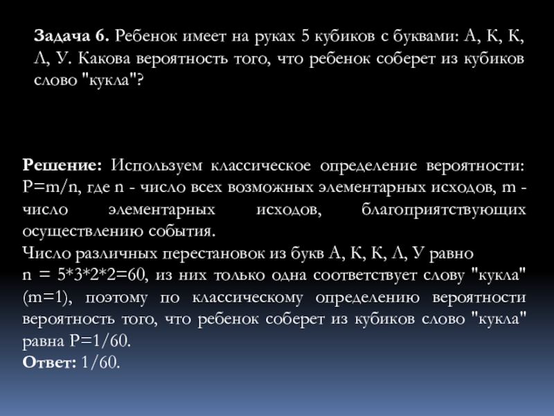 Задача 6. Ребенок имеет на руках 5 кубиков с буквами: А, К, К, Л, У. Какова вероятность того, что ребенок соберет из кубиков слово "кукла"?
