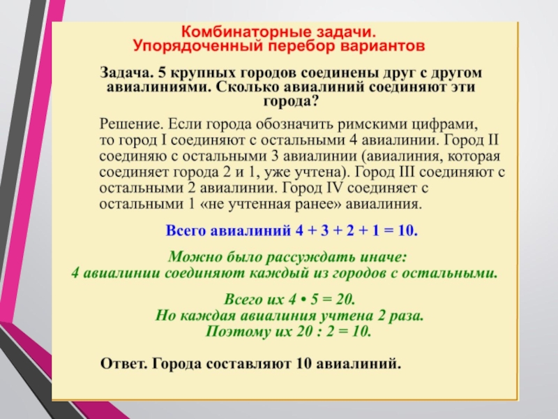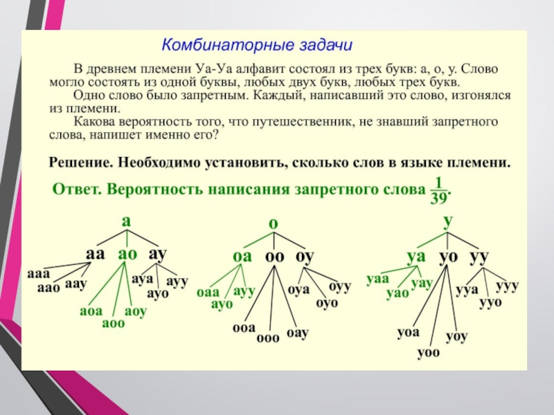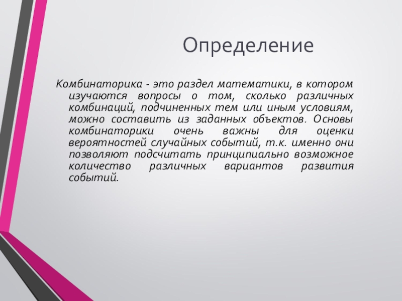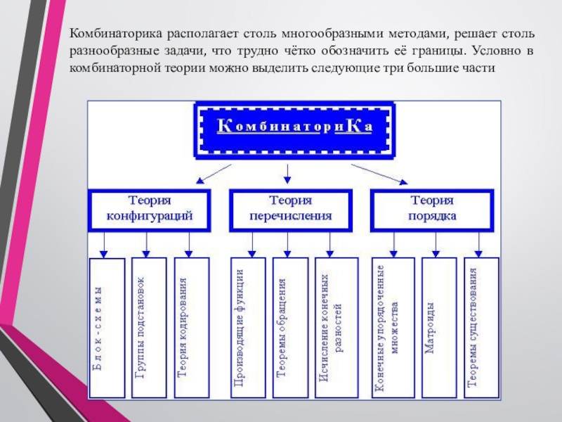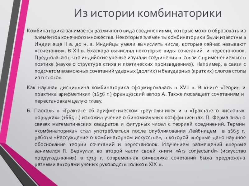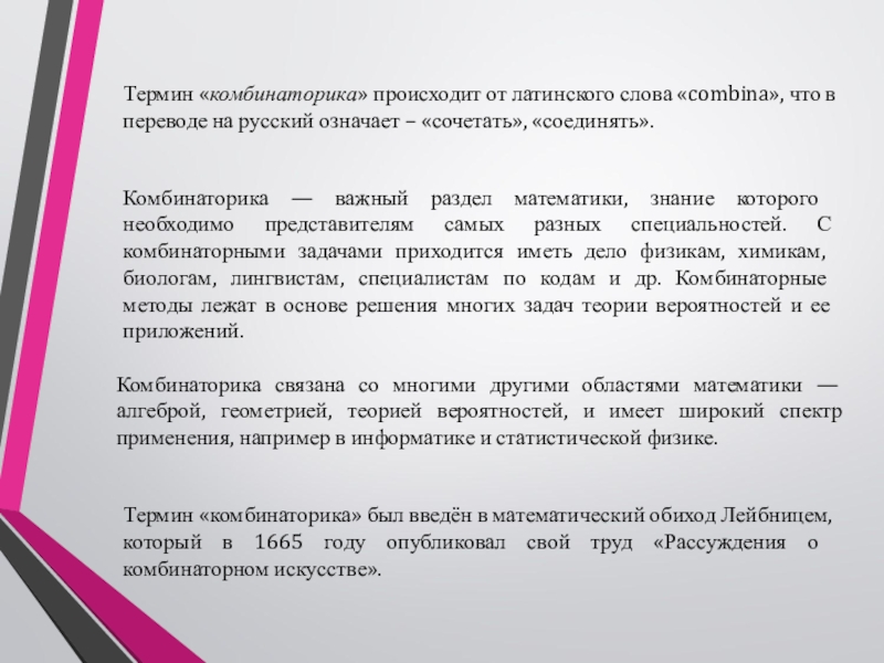 Термин «комбинаторика» происходит от латинского слова «combina», что в переводе на русский означает – «сочетать», «соединять».
