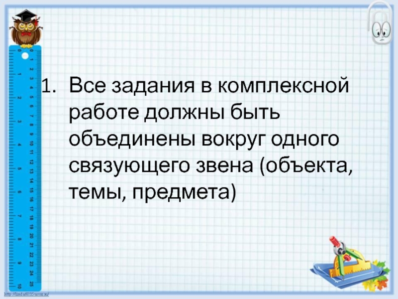 Слайд 4Все задания в комплексной работе должны быть объединены вокруг одного связующего