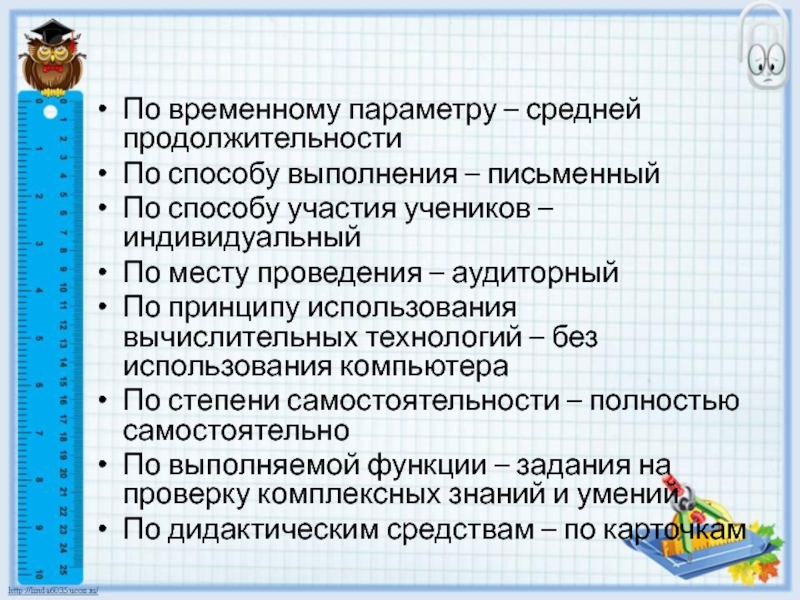 По временному параметру – средней продолжительностиПо способу выполнения – письменный По способу участия учеников – индивидуальныйПо месту