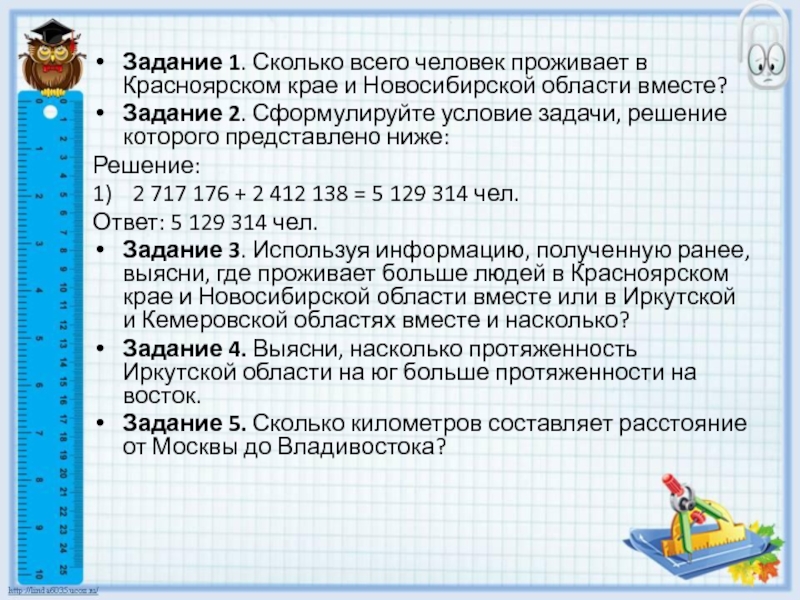 Задание 1. Сколько всего человек проживает в Красноярском крае и Новосибирской области вместе?Задание 2. Сформулируйте условие задачи,