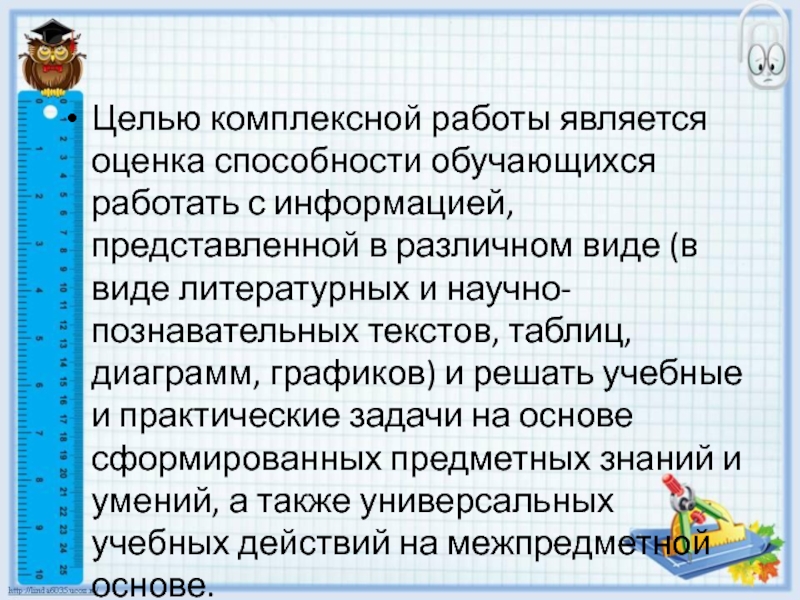 Слайд 3Целью комплексной работы является оценка способности обучающихся работать с информацией, представленной