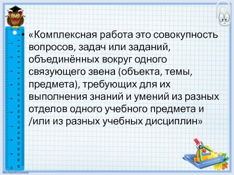 «Комплексная работа это совокупность вопросов, задач или заданий, объединённых вокруг одного связующего звена (объекта, темы, предмета), требующих для их выполнения знаний и умений из разных отделов одного учебного предмета и /или из разных учебных дисциплин»
